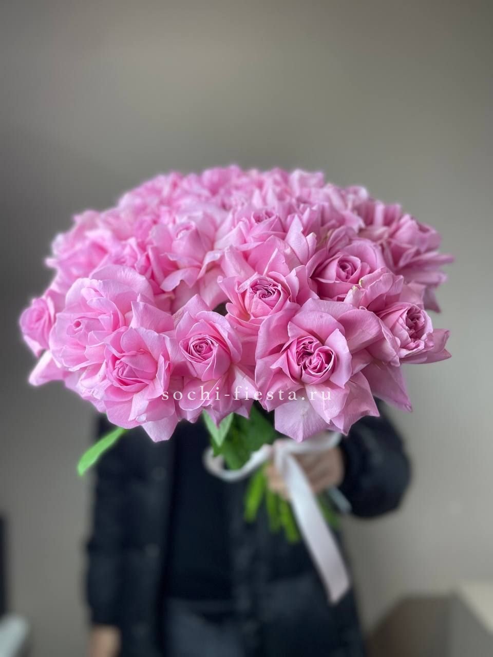 Двадцать пять вывернутых бутонов образуют плотную шапку цвета утренней дымки. Лепестки раскрыты наружу и создают объемную текстуру. Монобукет для тех, кто ценит чистоту формы.