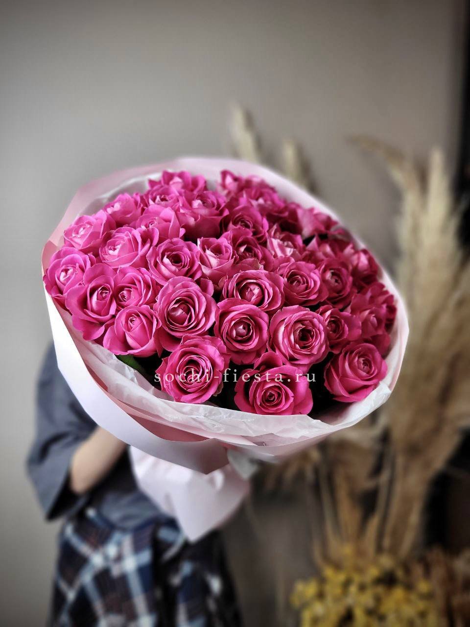Тридцать пять стеблей формируют объемную композицию в розовой гамме. Букет занимает пространство уверенно и держит форму за счет плотной сборки. Классика, которая работает всегда.