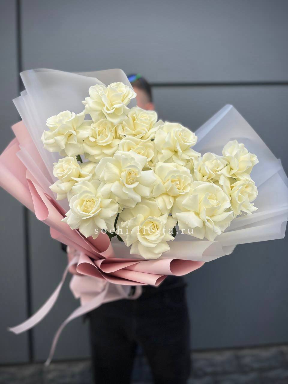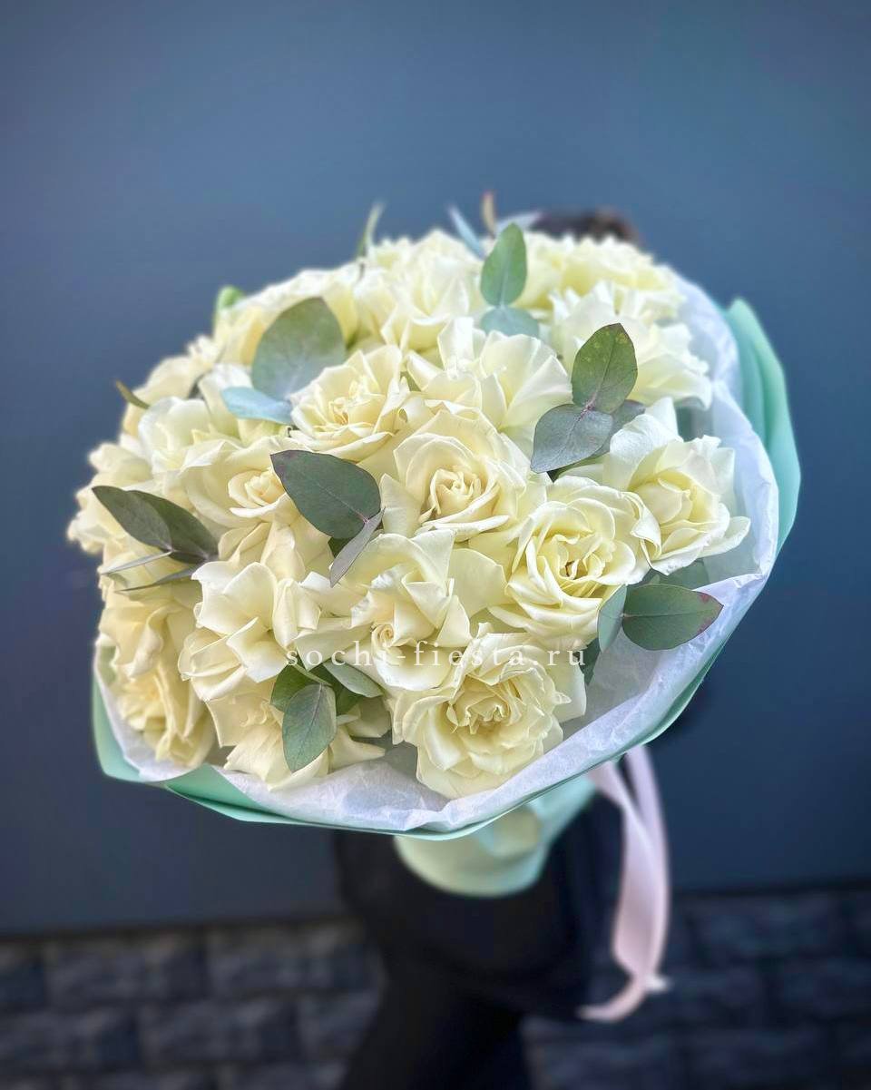 Девятнадцать вывернутых роз собраны в плотный букет, где каждый бутон развернут наружу и демонстрирует сложную структуру лепестков. Белый цвет звучит чисто и уверенно.