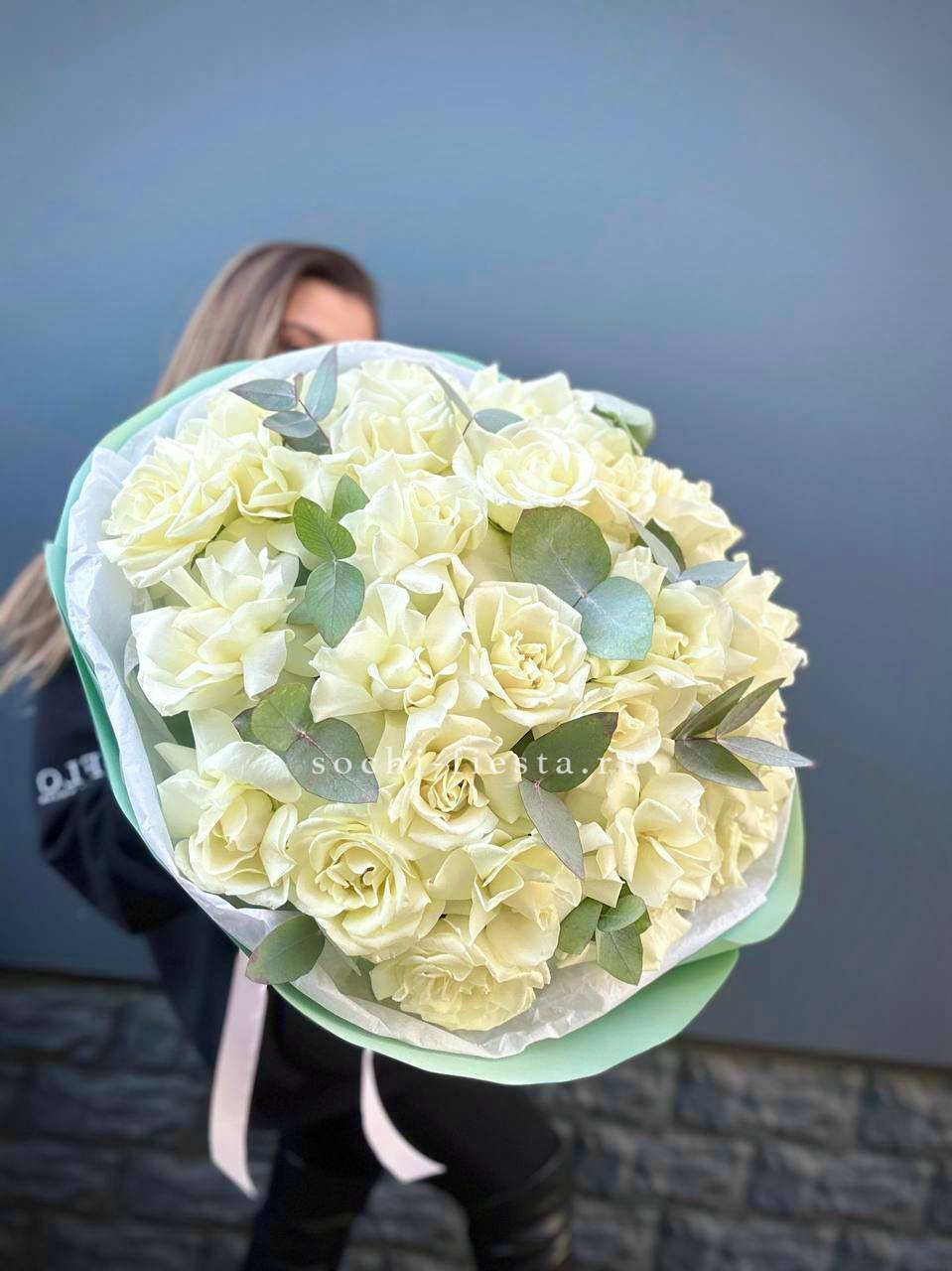 вывернутые розы - 19 шт., эвкалипт - 1шт., лента, авторская упаковка.