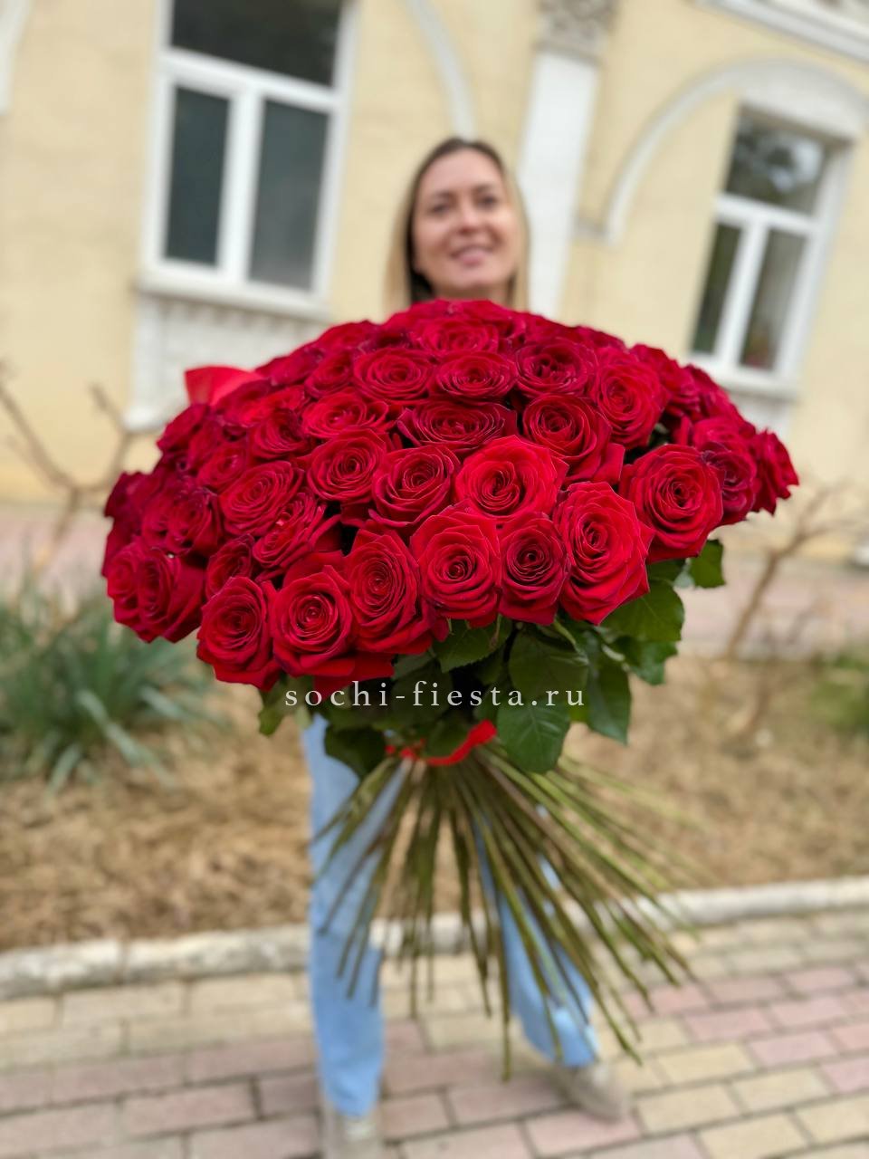 101 красная голландская роза (фридом или эксплорер), лента, упаковка на выбор.