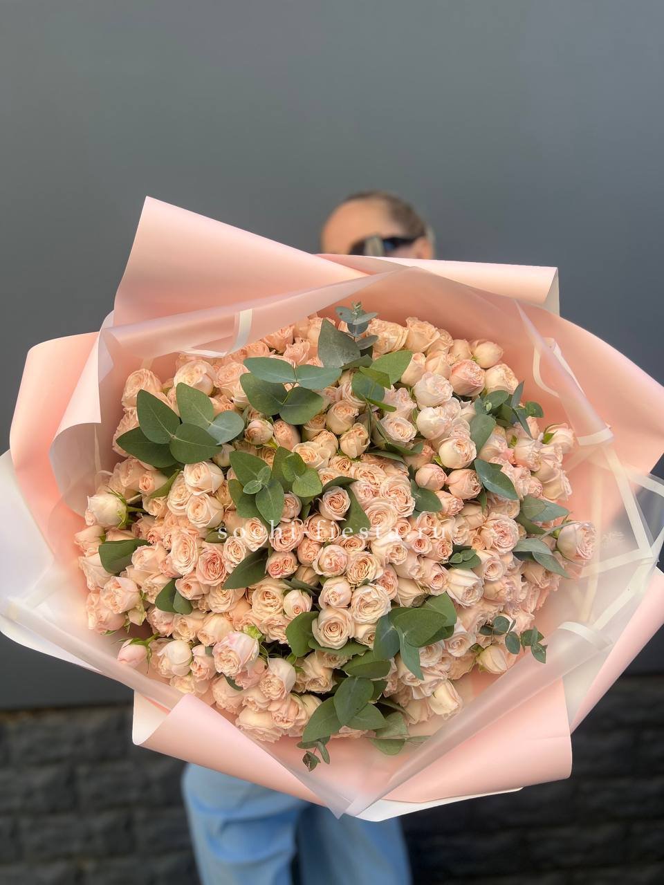 101 кремовая кустовая роза, эвкалипт, лента, дизайнерская упаковка.