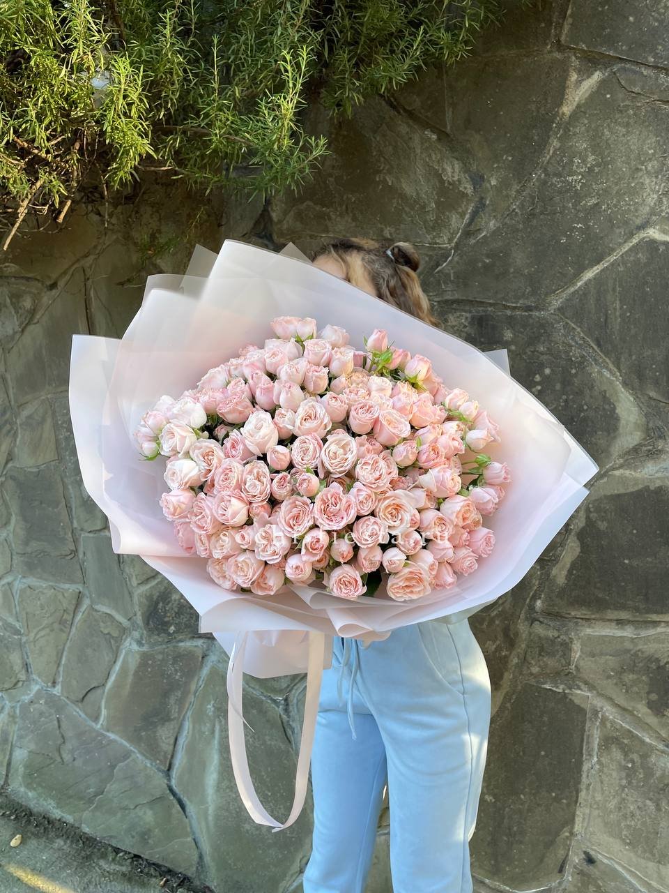 пионовидные розы Бомбастик нежных оттенков, лента, упаковка.