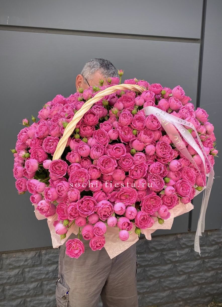 Сто пятьдесят один бутон формирует масштабную композицию, которая заполняет пространство цветом и текстурой. Корзина становится основой для впечатляющего объема.