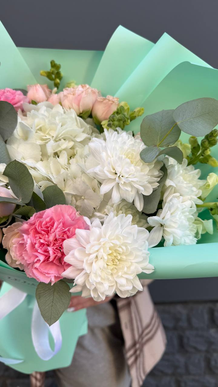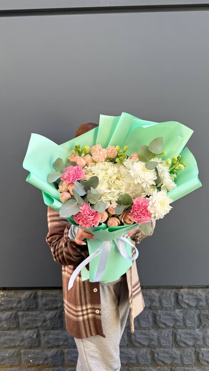 гортензия, герберы, эустомы, розы, диантус, эвкалипт, лента, дизайнерская упаковка.