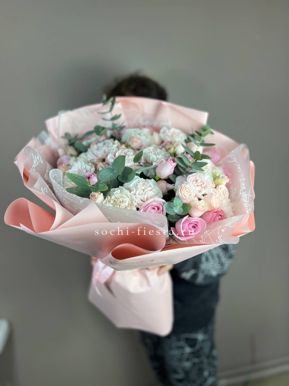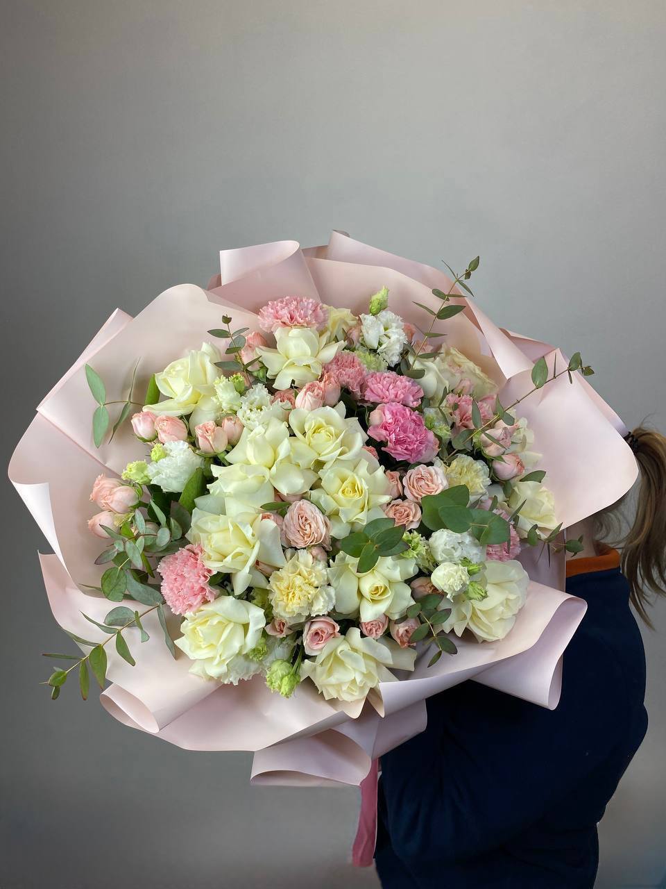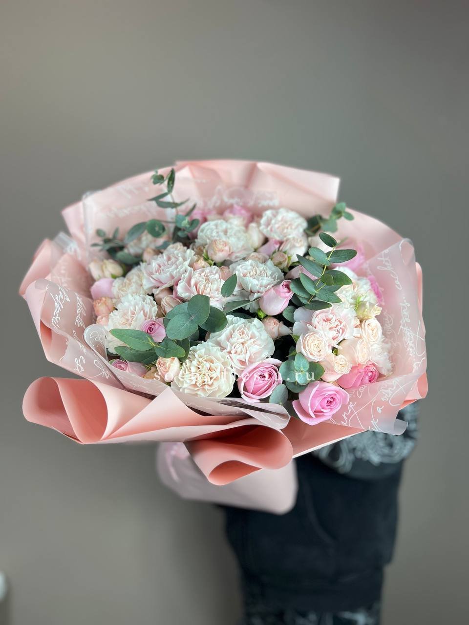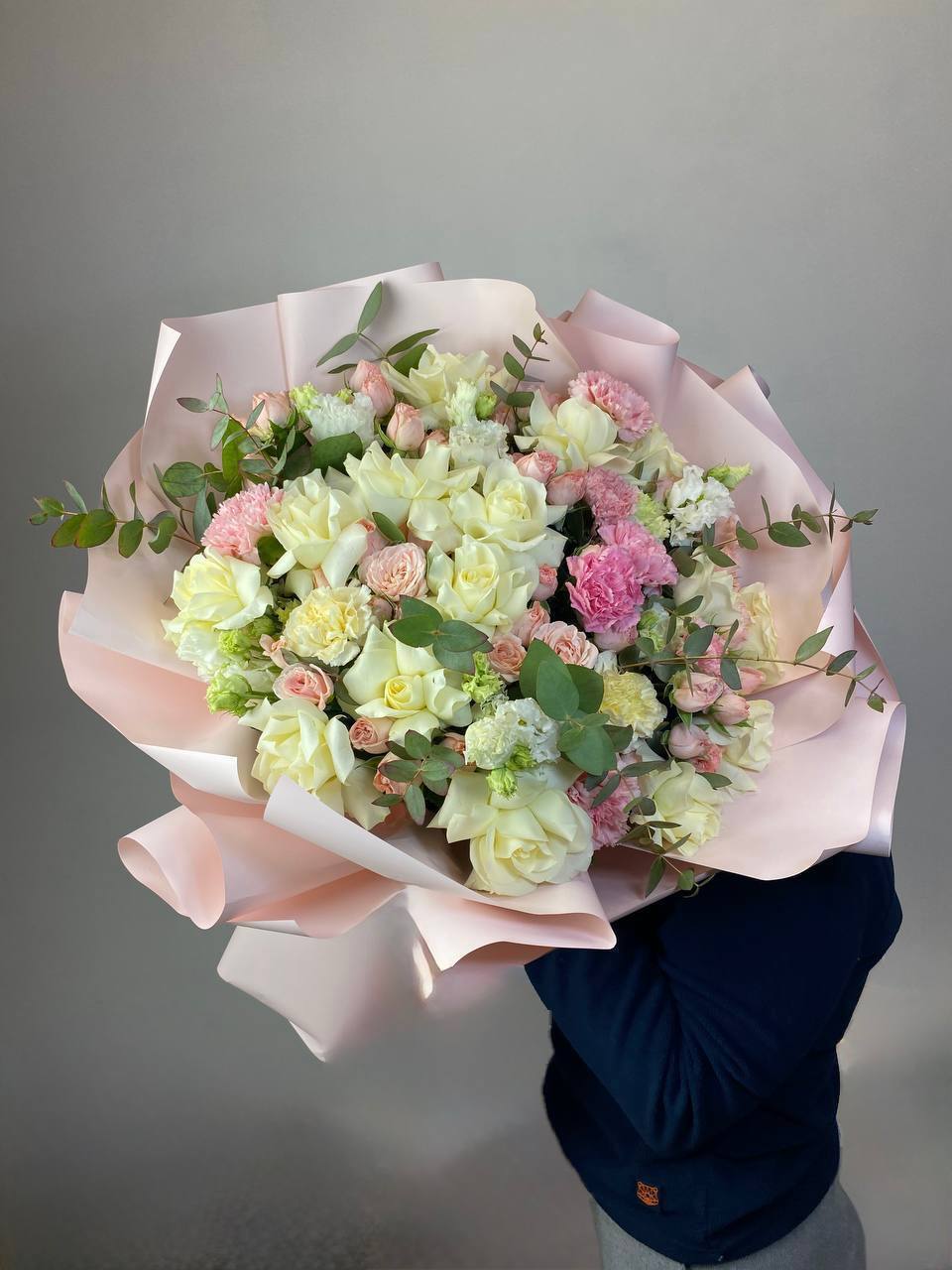 диантус, бомбастик, белые розы, эвкалипт, эустома, упаковка.
