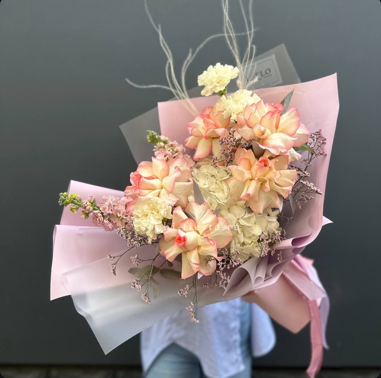 Белые шапки гортензии обрамляют пышные розы Мисти Бабблс с их узнаваемой многослойной структурой. Мягкая гамма и плавные переходы между соцветиями создают объёмную композицию спокойного звучания.