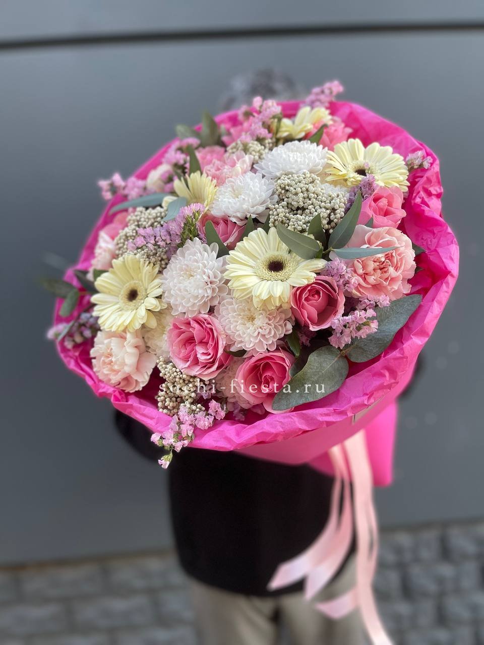 Состав букета: роза кустовая, хризантемы, озотамнус, диантус,  матрикария, упаковка, лента.