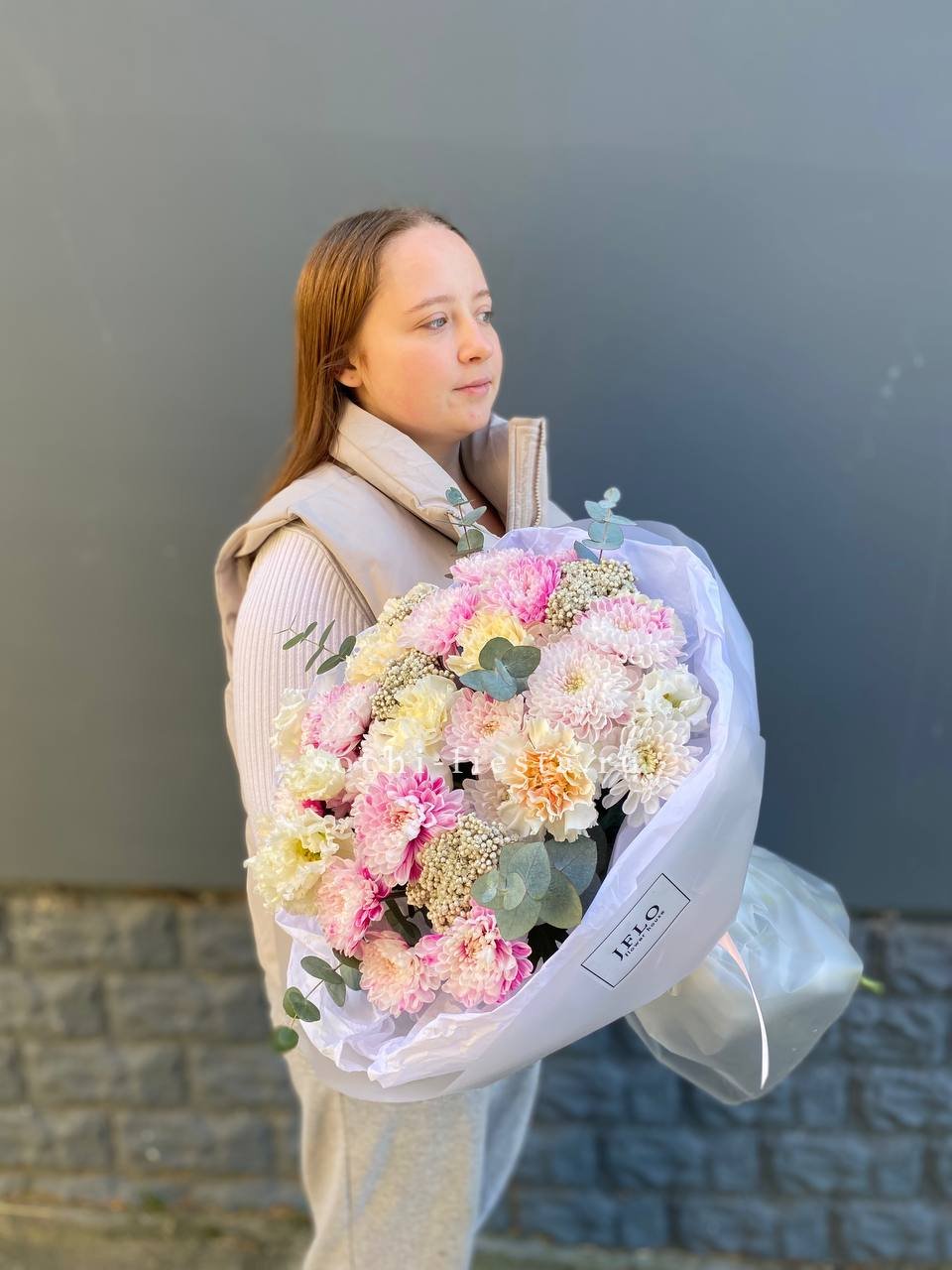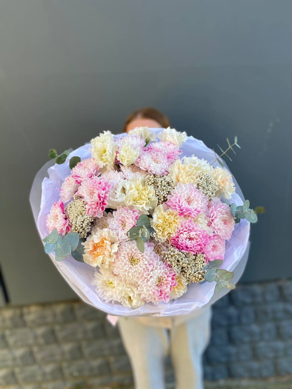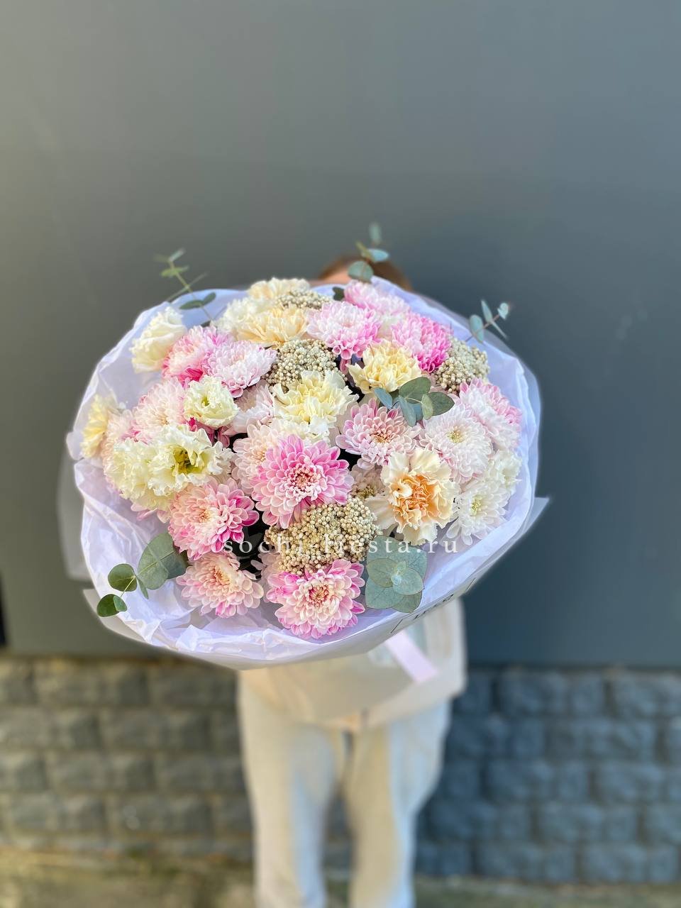 Воздушная композиция собирает кустовую хризантему, эустому и диантус в единый ритм. Озотамус и эвкалипт задают структуру, сохраняя свежесть надолго.