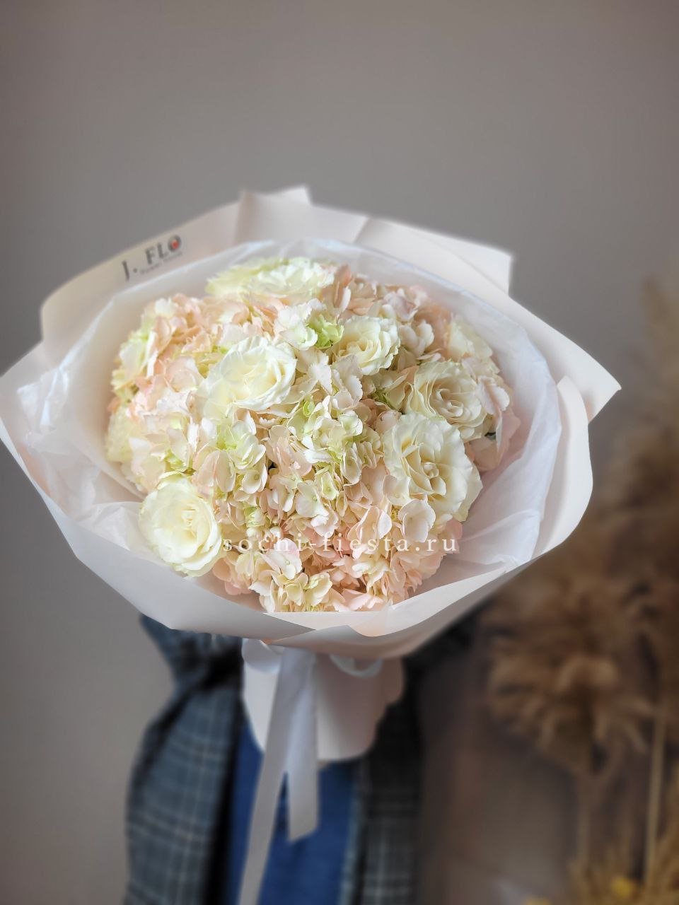 Пионы и эустома собраны в плотную округлую форму с выразительной текстурой лепестков. Белые и розовые оттенки создают мягкий переход без резких границ.