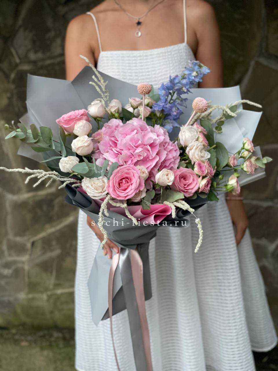 гортензия, хризантема, хамелациум, гербера, мисти баблс, диантус, пленка.