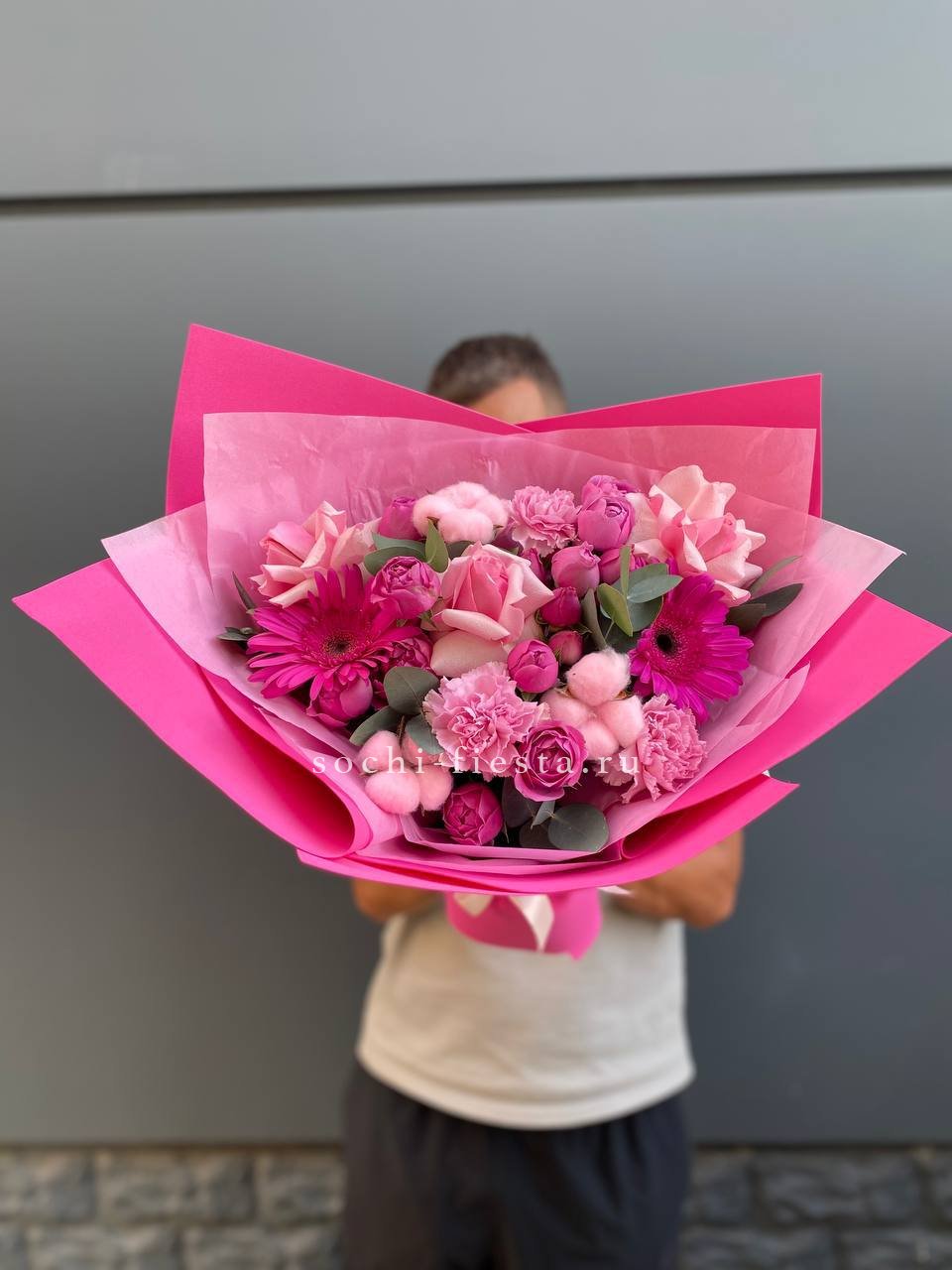 Герберы и розы собраны в плотный микс насыщенных оттенков. Хлопок добавляет мягкости, диантус разбивает ритм яркими вспышками.