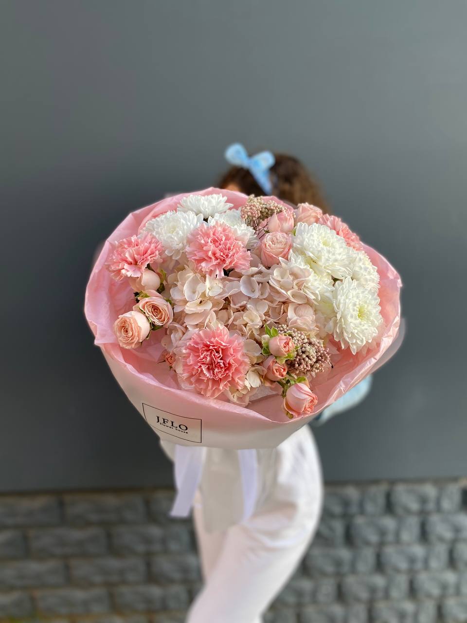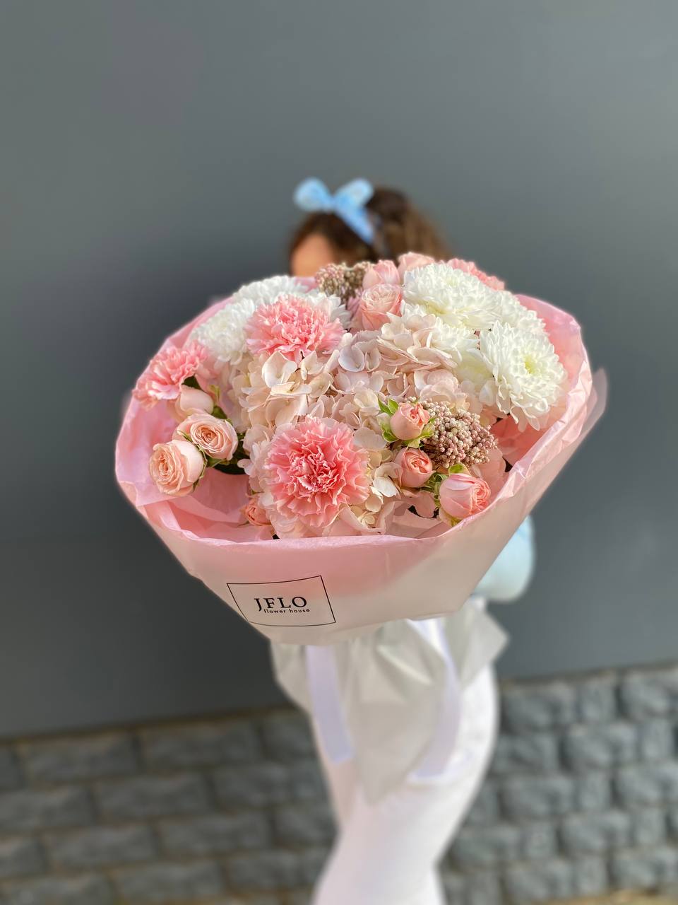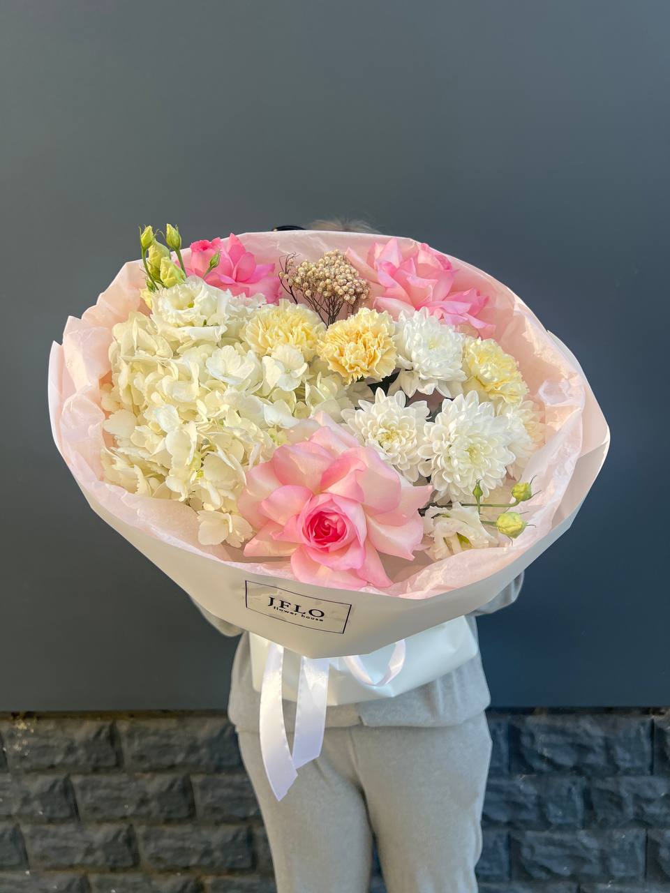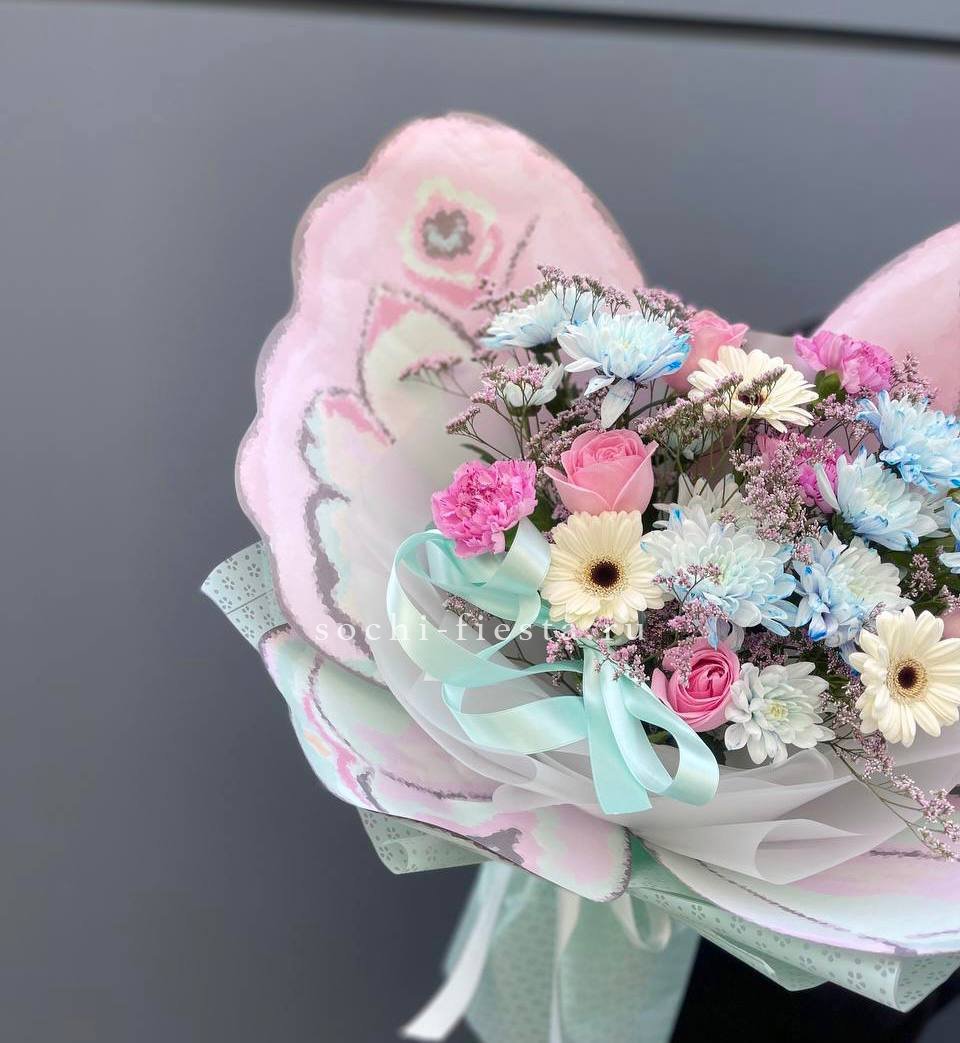 гортензия, диантус, хризантема, бомбастик, озатамус, пленка.