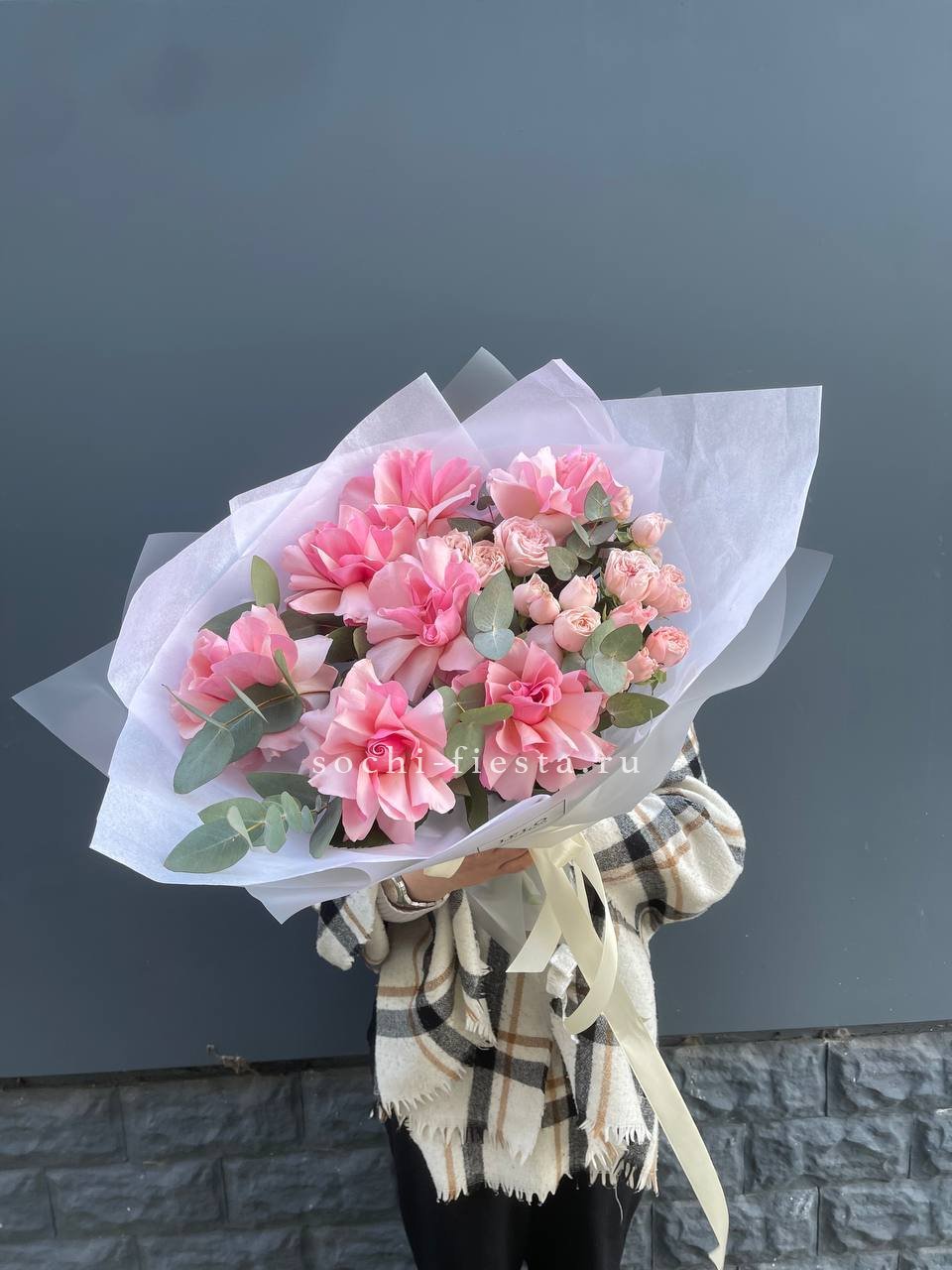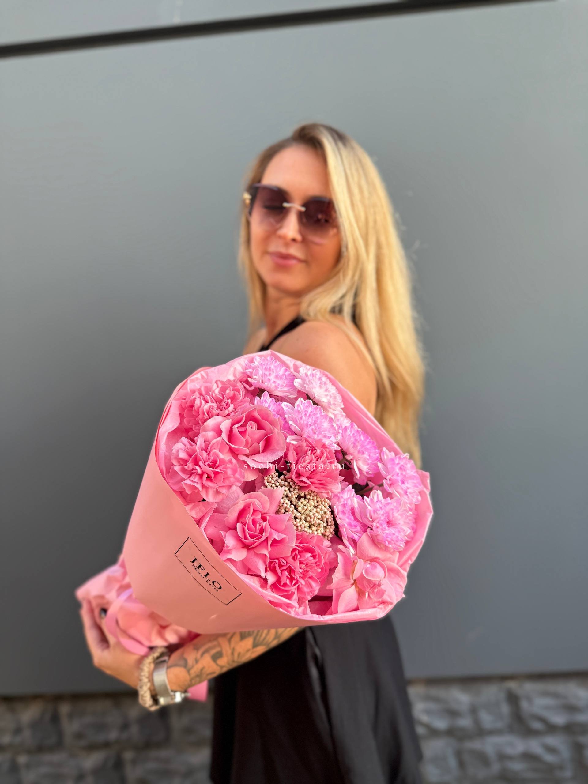 Хризантемы и розы переплетаются с диантусом и озотамнусом в букете насыщенных красок. Каждый цветок раскрывается по-своему, наполняя композицию движением и жизнью.
