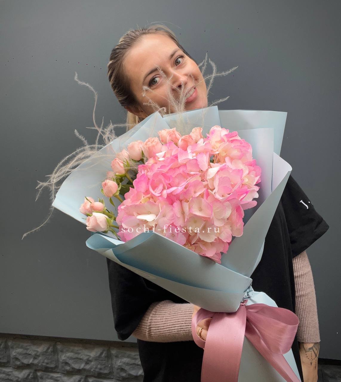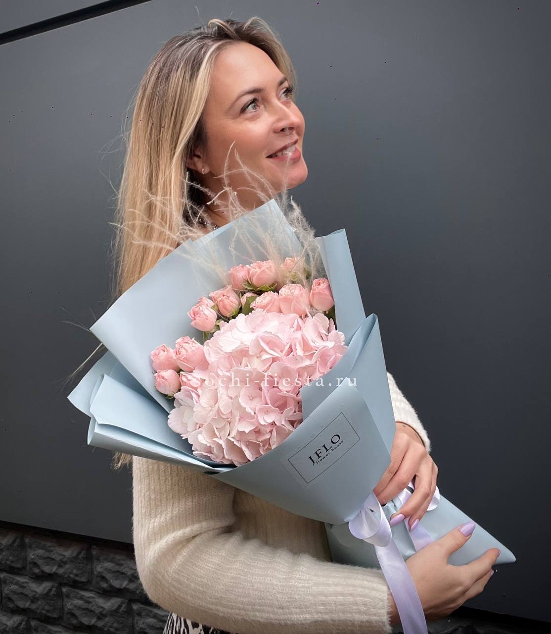 Гортензия образует пышную основу, сквозь которую проступают светлые головки эустомы и роз. Бомбастик вносит графичность, создавая объём и глубину.