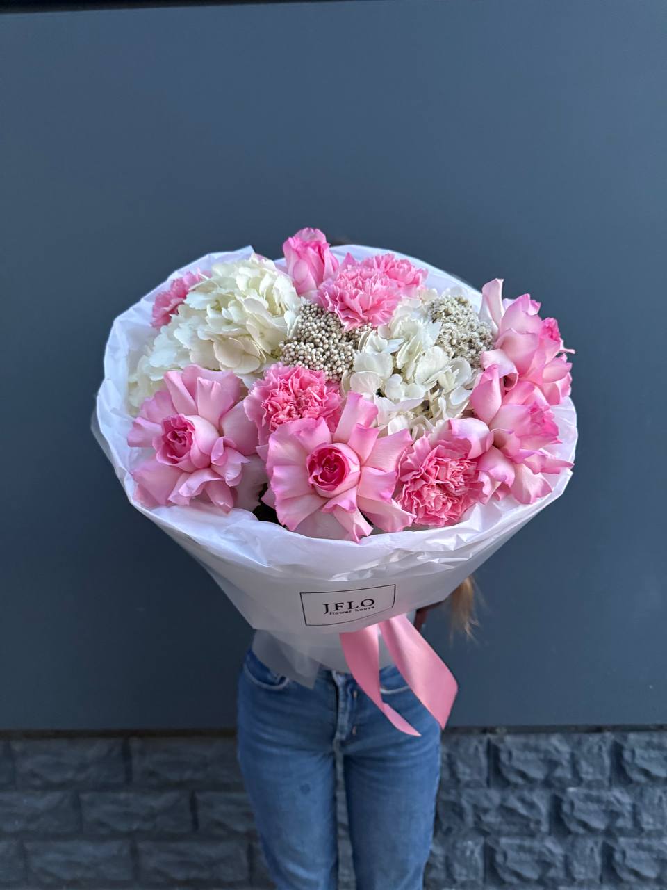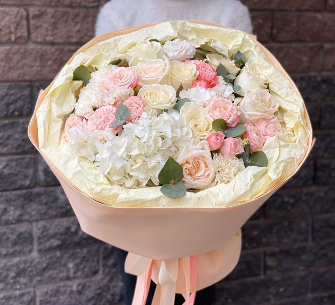 Воздушная композиция в пастельных тонах с пионовидными розами и гортензией создает объемную форму. Каждый бутон раскрывается слоями, а диантусы добавляют графичные точки среди крупных соцветий.
