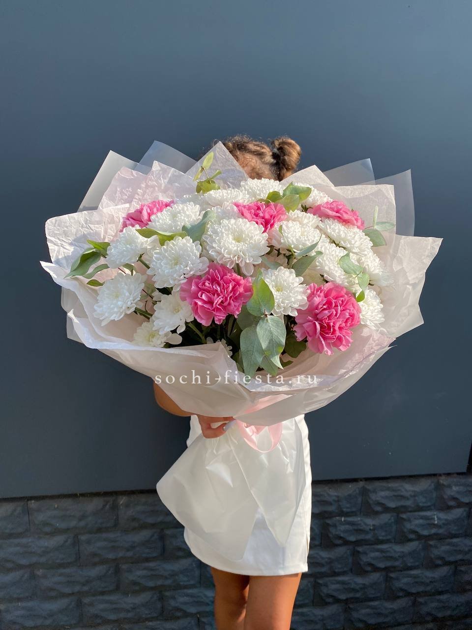 розы, пионовидные розы, эустома, диантусы, гортензия, эвкалипт, лента, фоамиран, тишью.