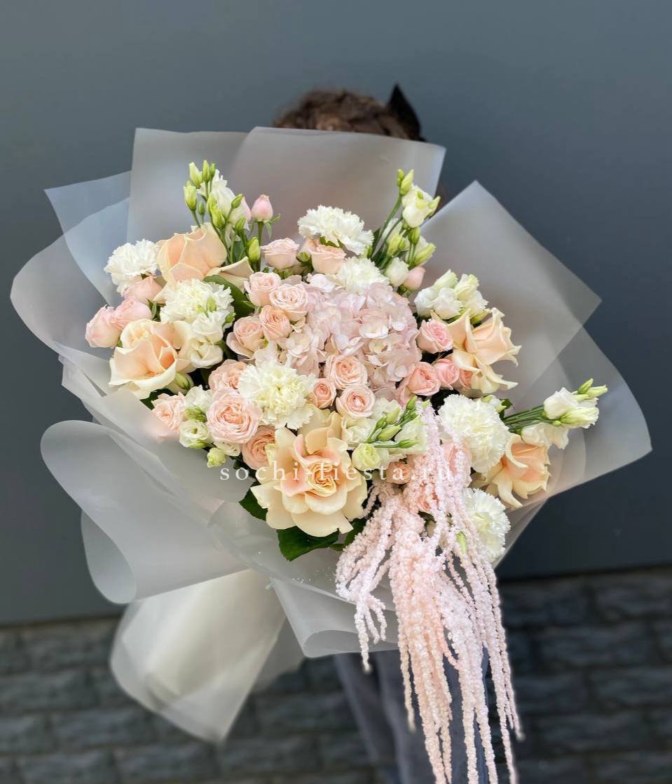 Крупные бутоны Джумилии соседствуют с воздушной гортензией и россыпью кустовых роз. Эвкалипт и хлопок создают спокойный фон для нежной палитры.