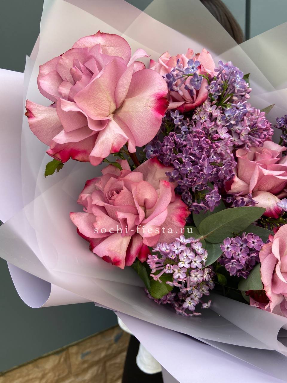 Розовые розы соседствуют с душистыми гроздьями сирени, создавая весеннее настроение даже в будний день. Эвкалипт добавляет свежести и завершает композицию спокойным зеленым фоном.