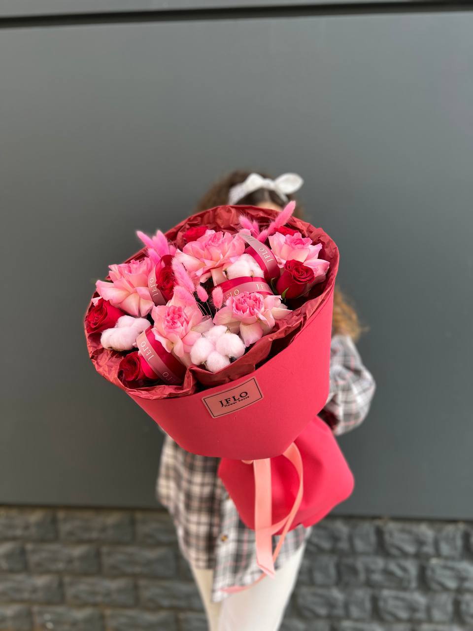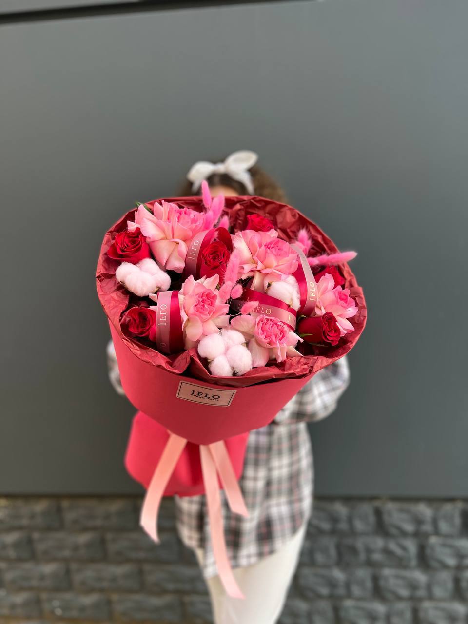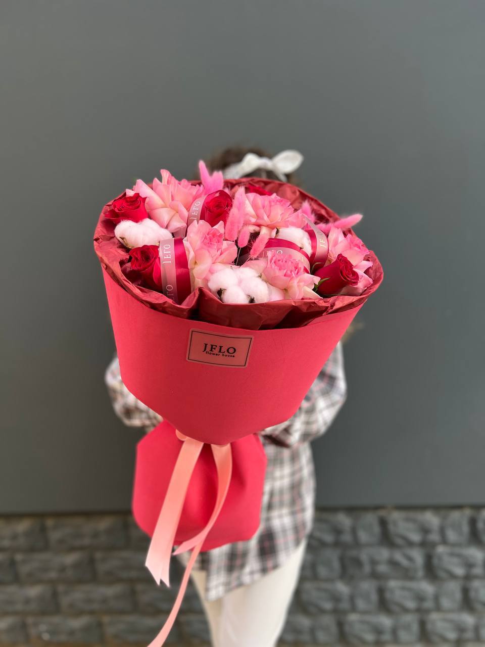 В центре внимания — фактуры и цвет! Современный, стильный букет, который сочетает бархатистые бутоны роз и мягкий хлопок. Это не просто цветы, а целая цветочная композиция для тех, кто ценит красоту в деталях. Отличный повод порадовать себя или близких!