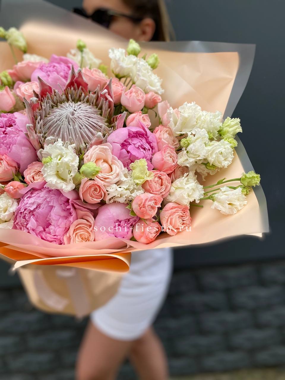 Пышные пионы окружены воздушными эустомами и миниатюрными кустовыми розами, а экзотичная протея добавляет композиции выразительный акцент. Бархатистые лепестки чередуются с полураскрытыми бутонами, создавая объёмную фактуру и глубину букета.
