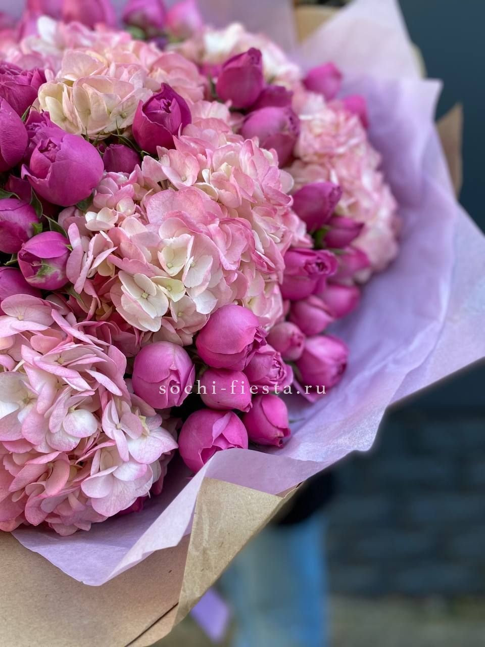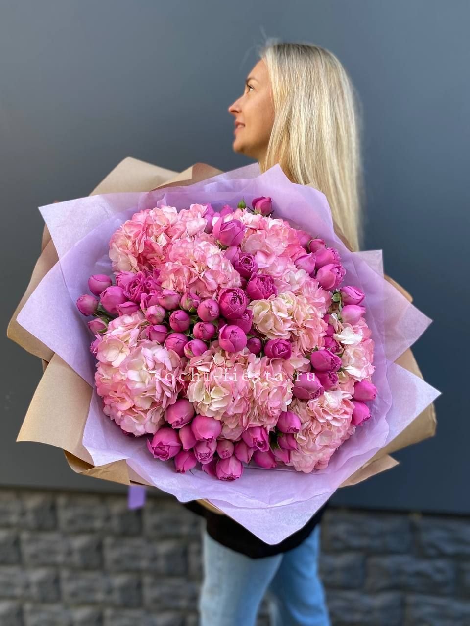 Масштабная композиция с пионами, эустомой и розами разворачивается во всей красе. Хризантемы и гортензия создают впечатляющее присутствие, которое преображает пространство вокруг.