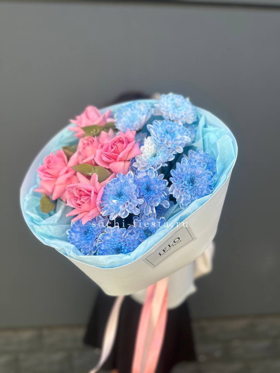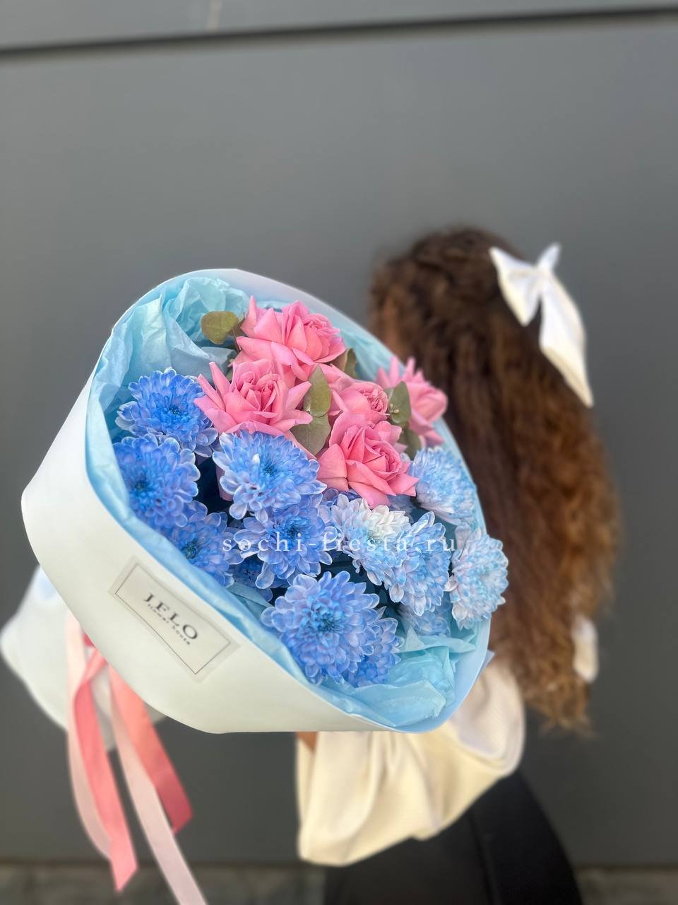 хризантема, гортензия, розовая роза, эустома, пионы ( может меняться, в зависимости от сезона), бомбастик, диантус, лента.