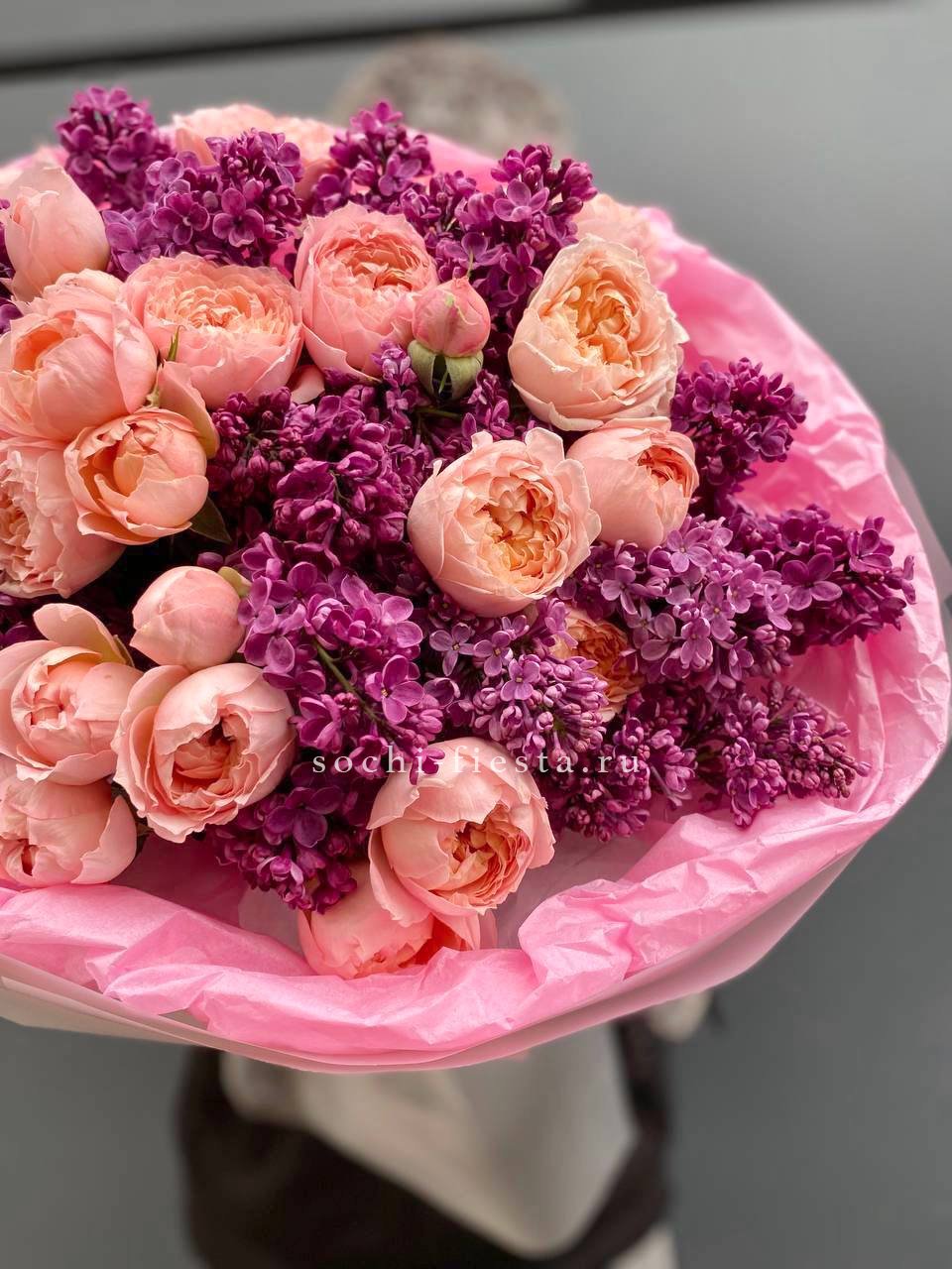 сирень, кустовые пионовидные розы, тишью, пленка, лента.