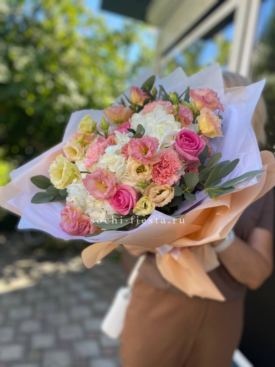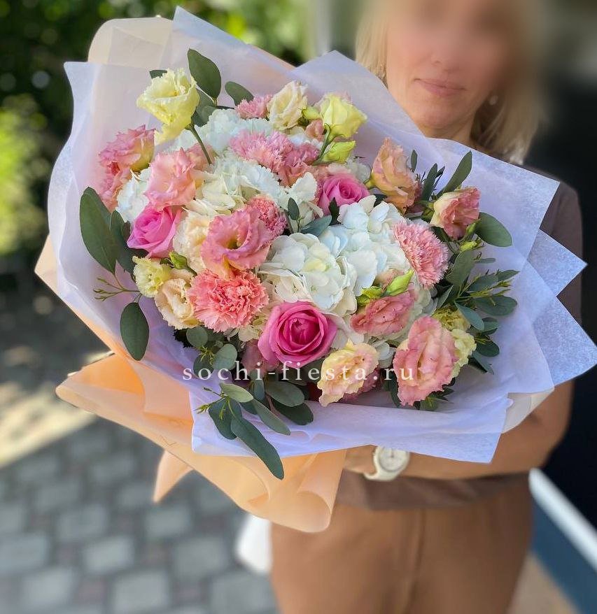 гортензия, пионовидная кустовая роза Мисти Баблс, лента, дизайнерская упаковка.