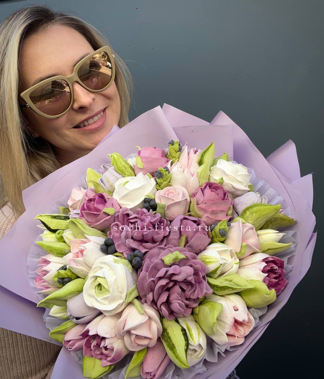 зефир в форме букета цветов. Состав: сахар, патока, пектин, агар, яблочное пюре, яичный белок, натуральный краситель, лимонная кислота. Цена за 1букет, размер М.