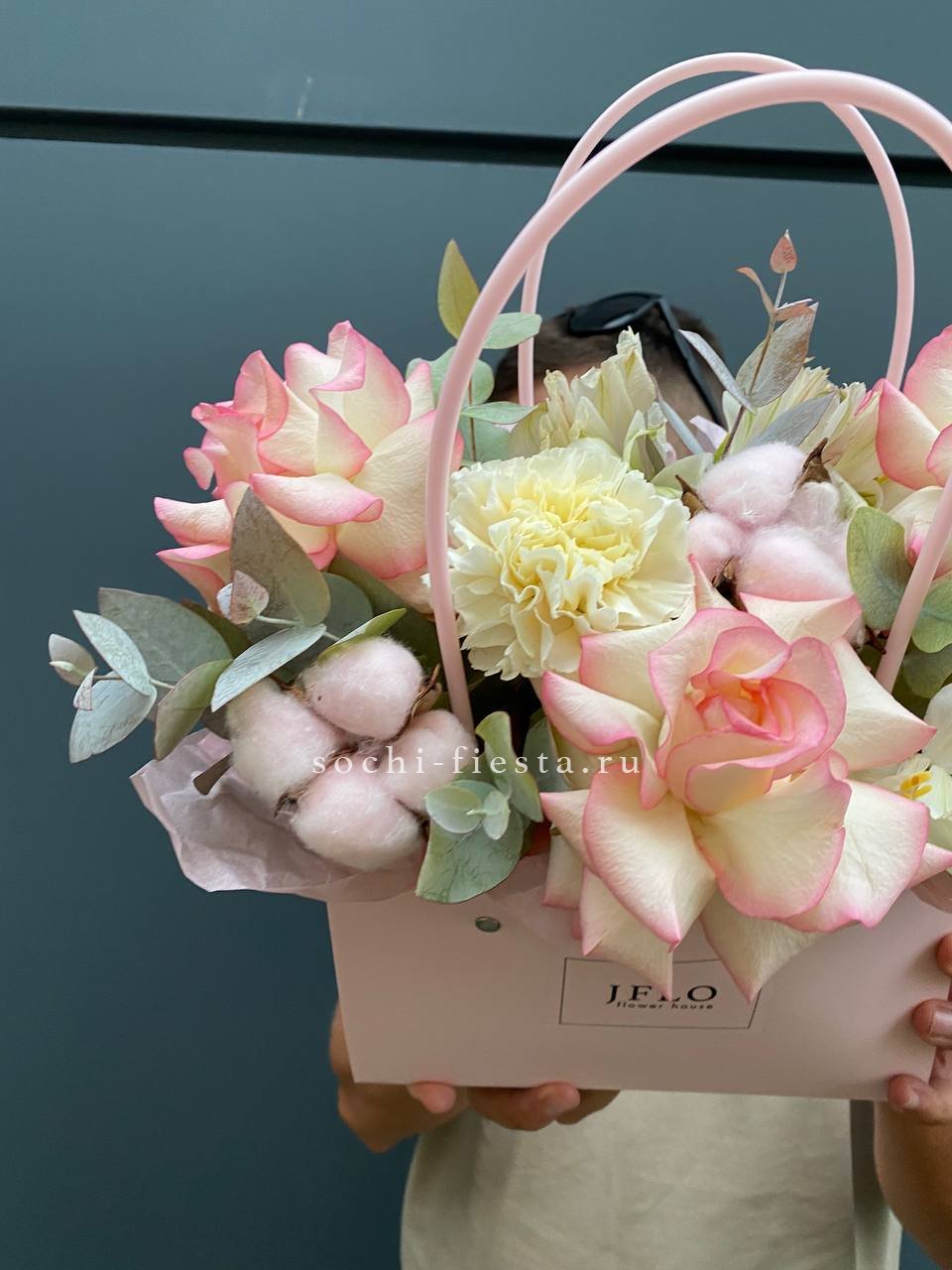 джумилия, хлопок, диантус, альстромерия, эвкалипт.