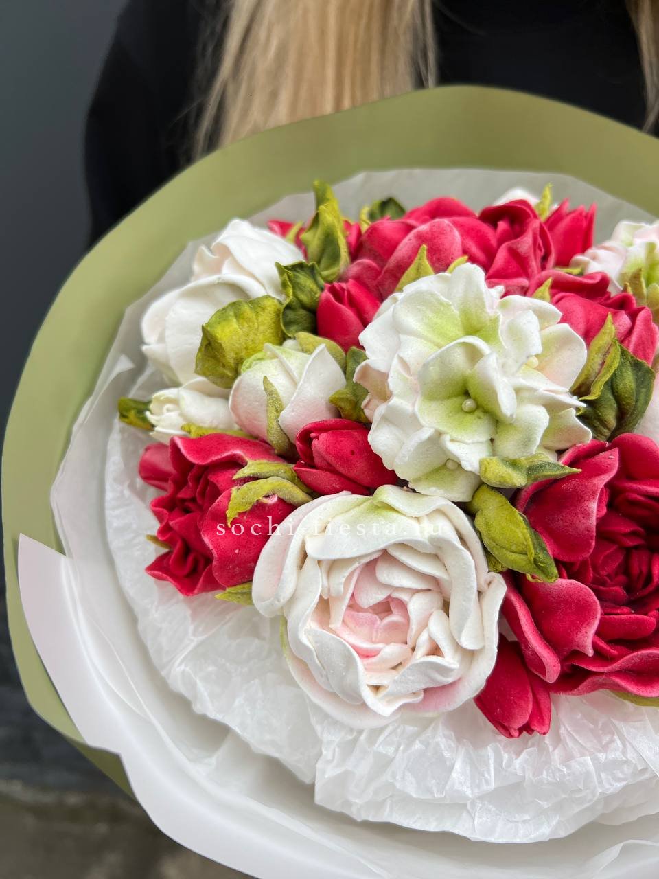 сахар, патока, пектин, агар, яблочное пюре, яичный белок, натуральный краситель, лимонная кислота. Цена за 1букет, размер S.