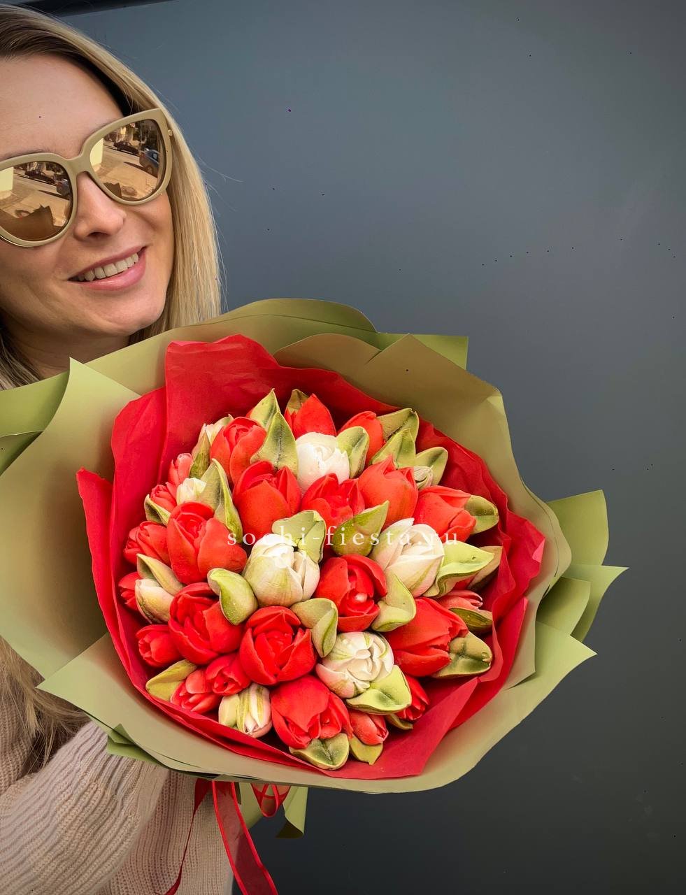 зефир в форме букета тюльпанов (каждый тюльпан выполнен отдельно и собран в букет). Состав: сахар, патока, пектин, агар, яблочное пюре, яичный белок, натуральный краситель, лимонная кислота. Цена за 1букет, размер SX.